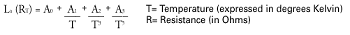 电阻-温度特性是指热敏电阻的零功率电阻与其外壳温度之间的关系。作为一种经验表达式,Steinhart-Hart方程式是NTC热敏电阻的电阻-温度特性最理想的数学表达式。用于确定这些常数的计算非常繁琐。如要解出这些常数,请联系于2017年被Littelfuse收购的U.S. Sensor Corp.®的应用工程部门,以获取BASIC程序列表的副本。